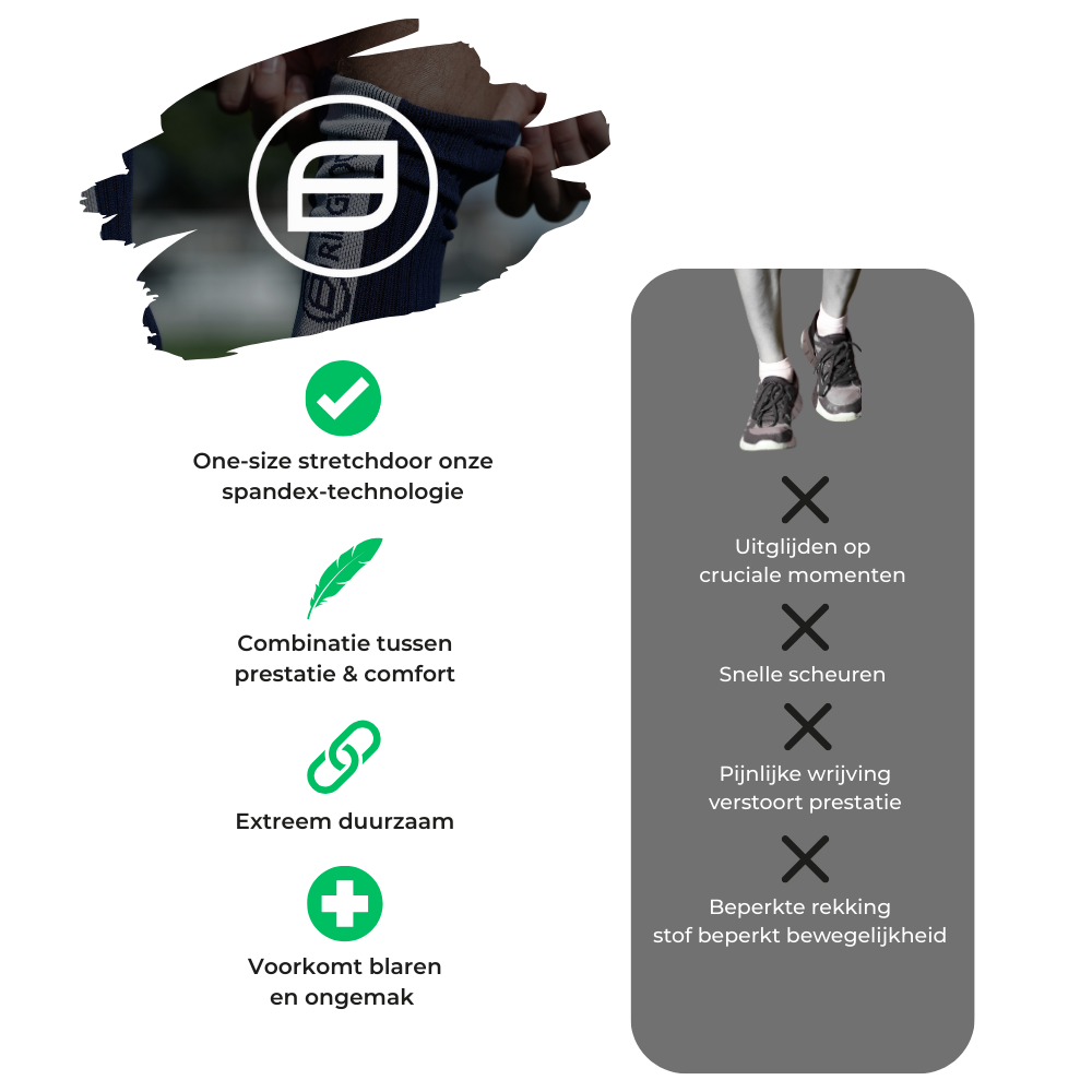 De sokken zijn geschikt voor iedereen met een schoenmaat van 37 tot 48. Dat is mogelijk dankzij de innovatieve spandex-technologie in de sokken die voor de compressie zorgen en de vorm van jouw voet aanneemt!
